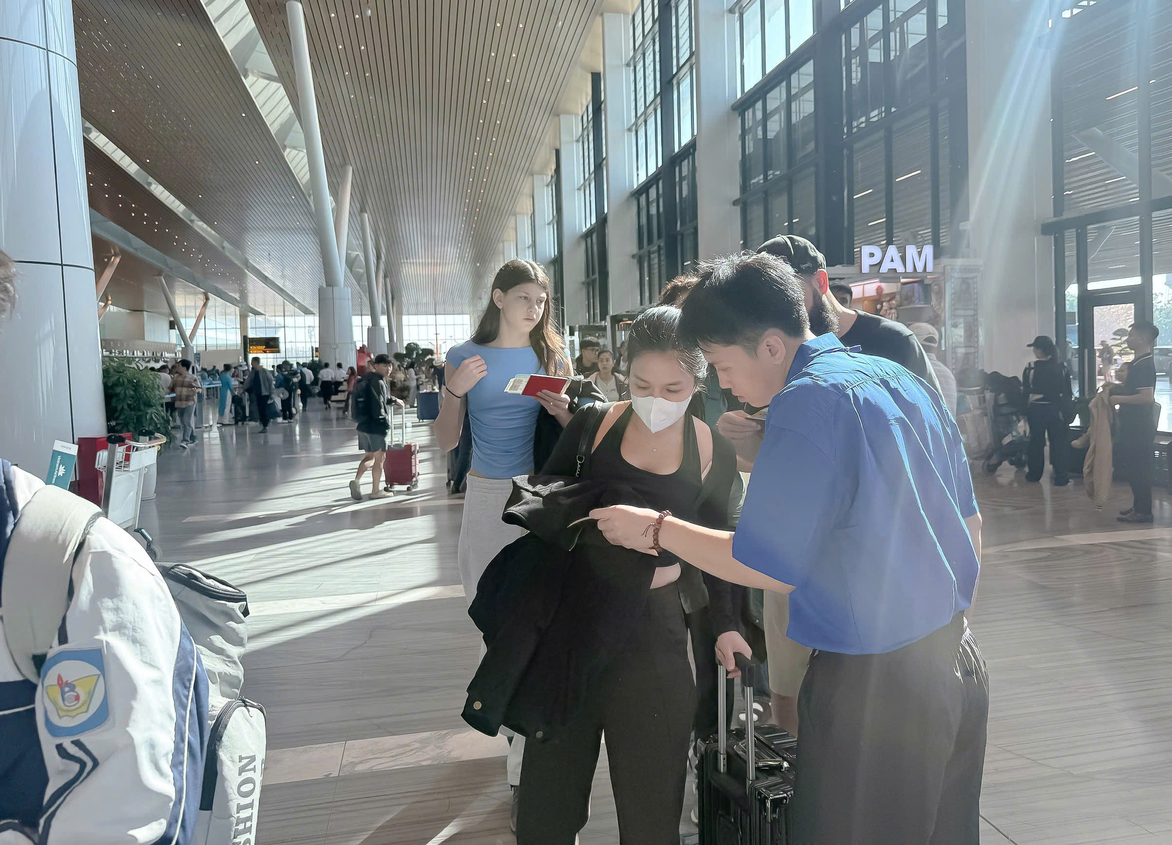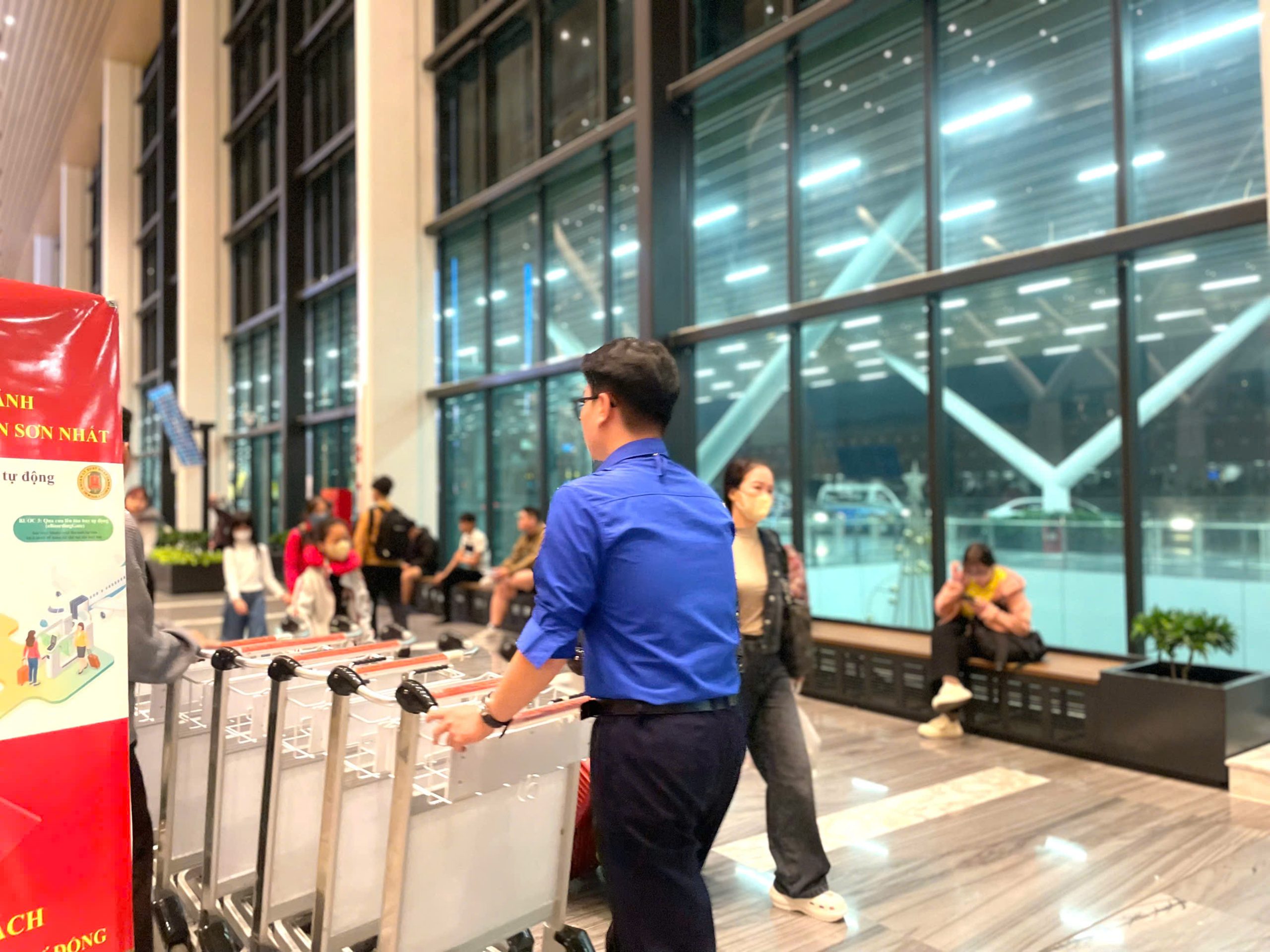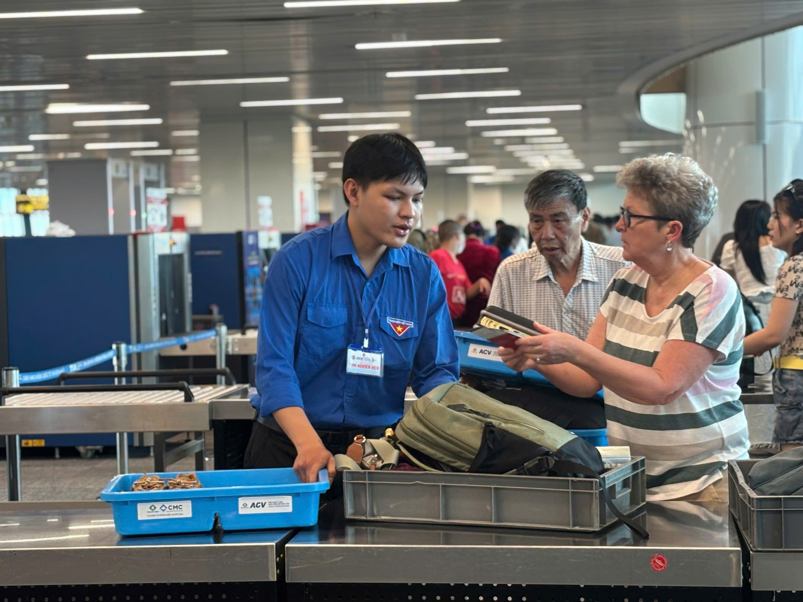 Tình nguyện viên hỗ trợ hành khách làm thủ tục hàng không, check-in và di chuyển trong khu vực nhà ga. (Ảnh: Đoàn Thanh niên – Hội Sinh viên VAA)