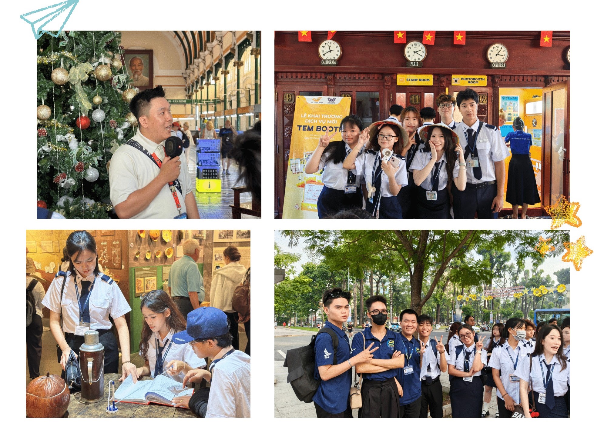 Từ Nhà thờ Đức Bà, đoàn tiếp tục di chuyển sang Bưu điện Thành phố Hồ Chí Minh – công trình hơn 130 năm tuổi mang đậm kiến trúc Pháp cổ. Những mái vòm cao, các ô cửa xanh đặc trưng và bản đồ Sài Gòn xưa đã khiến không ít sinh viên thích thú, mở ra góc nhìn rõ nét về một Sài Gòn vừa hoài niệm vừa tràn đầy sức sống.