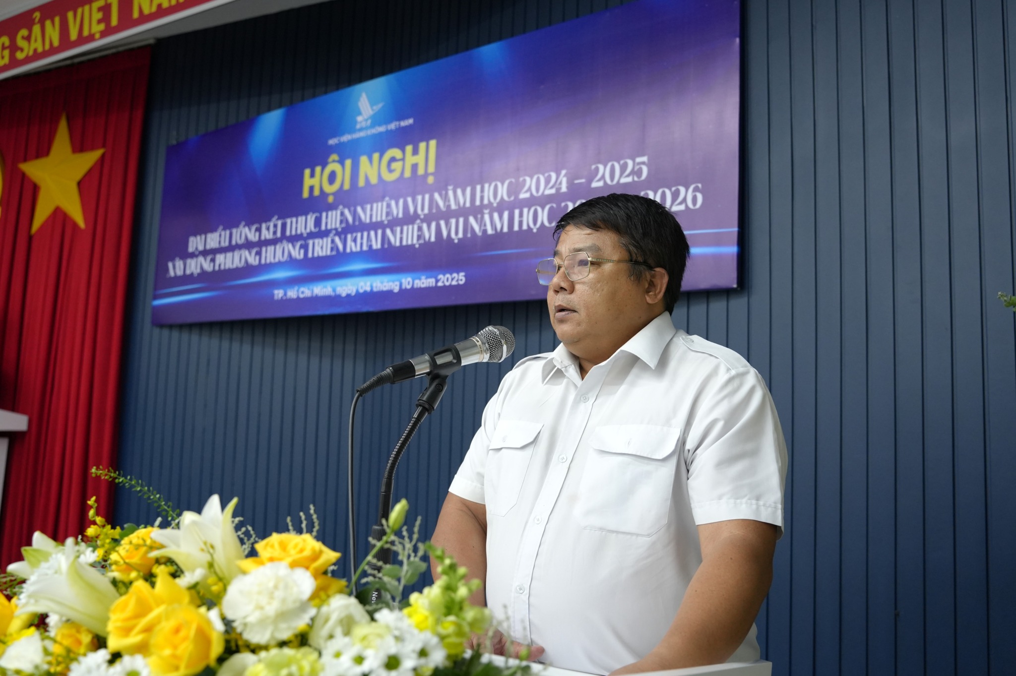 On the afternoon of October 4, 2025, at Room A201, the Vietnam Aviation Academy (VAA) held the Conference on Summarizing the 2024–2025 academic year and developing the directions and tasks for the 2025–2026 academic year. The event was attended by Mr. Nguyen Thanh Tung – Member of the Executive Committee of the Vietnam General Confederation of Labor, Standing Vice Chairman of the Vietnam Construction Trade Union, along with the Academy Council, the Board of Directors, representatives of departments, and a large number of staff and lecturers.