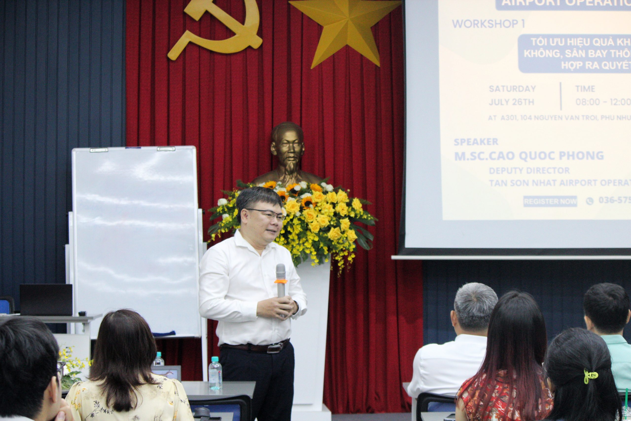 Workshop đầu tiên trong chuỗi chuyên đề đã mở màn ấn tượng với phần trình bày của Ông Cao Quốc Phong – Phó Giám đốc Trung tâm Điều hành Cảng Hàng không Quốc tế Tân Sơn Nhất. Chủ đề về mô hình Phối hợp ra quyết định tại cảng hàng không, sân bay (A-CDM) đã nhanh chóng thu hút sự quan tâm sâu sắc từ giới chuyên môn, giảng viên, sinh viên và cán bộ kỹ thuật trong ngành hàng không.