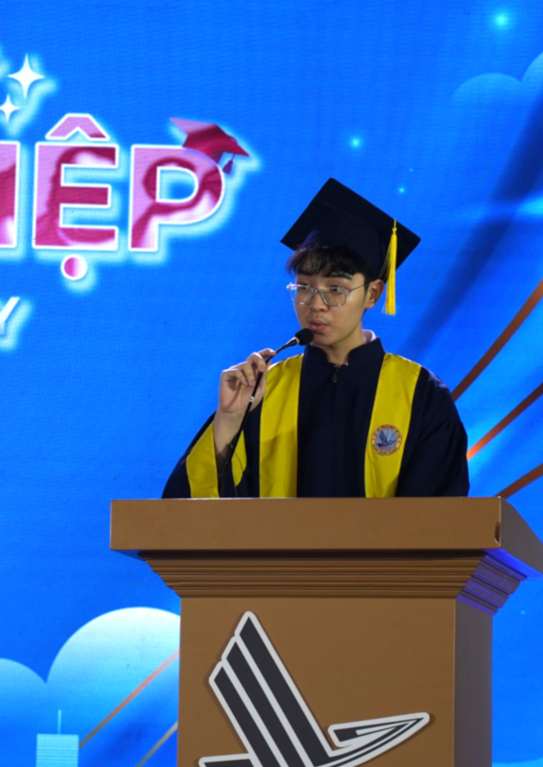 Nguyễn Tuấn Định (ngành Ngôn ngữ Anh, thủ khoa tốt nghiệp 2025) gây ấn tương với câu nói “chúng ta không sinh ra để tránh nhiễu động, mà để kiên cường vượt qua nó”
