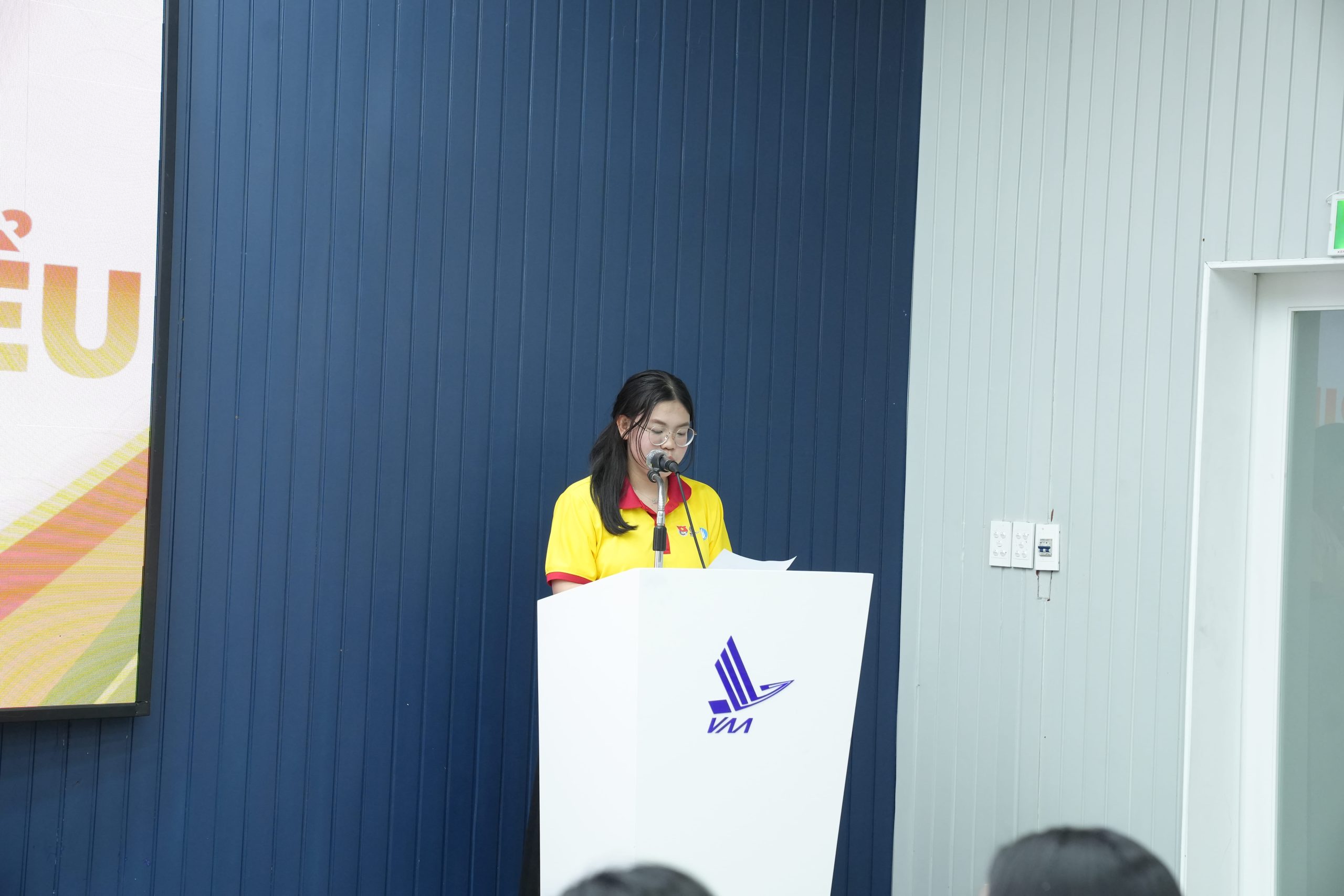 Đ/c Nguyễn Huỳnh Hồng Cẩm – Chủ tịch Hội Sinh viên Việt Nam Học viện, Chỉ huy Trưởng Chiến dịch Xuân Tình nguyện 2026 báo cáo kết quả và tổng kết các hoạt động nổi bật của chiến dịch. (Ảnh: Đoàn Thanh niên – Hội Sinh viên VAA)