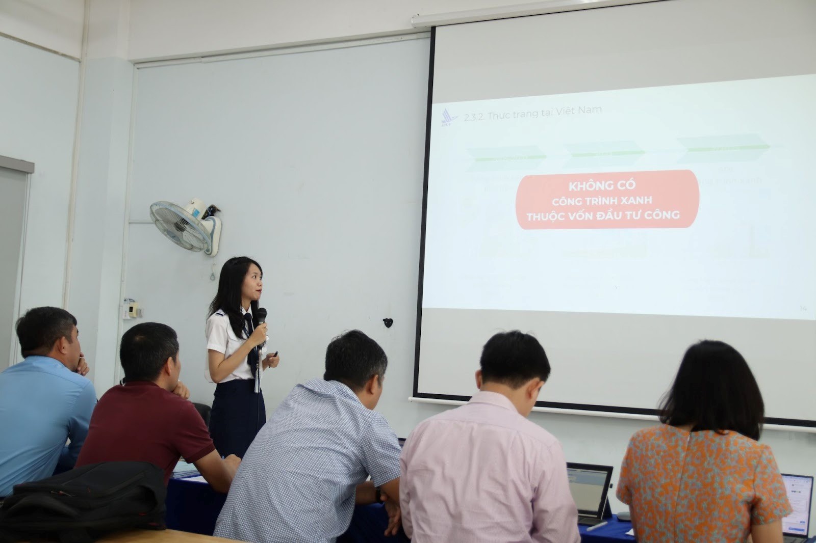 Sinh viên Nguyễn Trúc Lin Na đại diện nhóm nghiên cứu báo cáo bài Nghiên cứu Khoa học (Ảnh: Khoa Xây dựng)