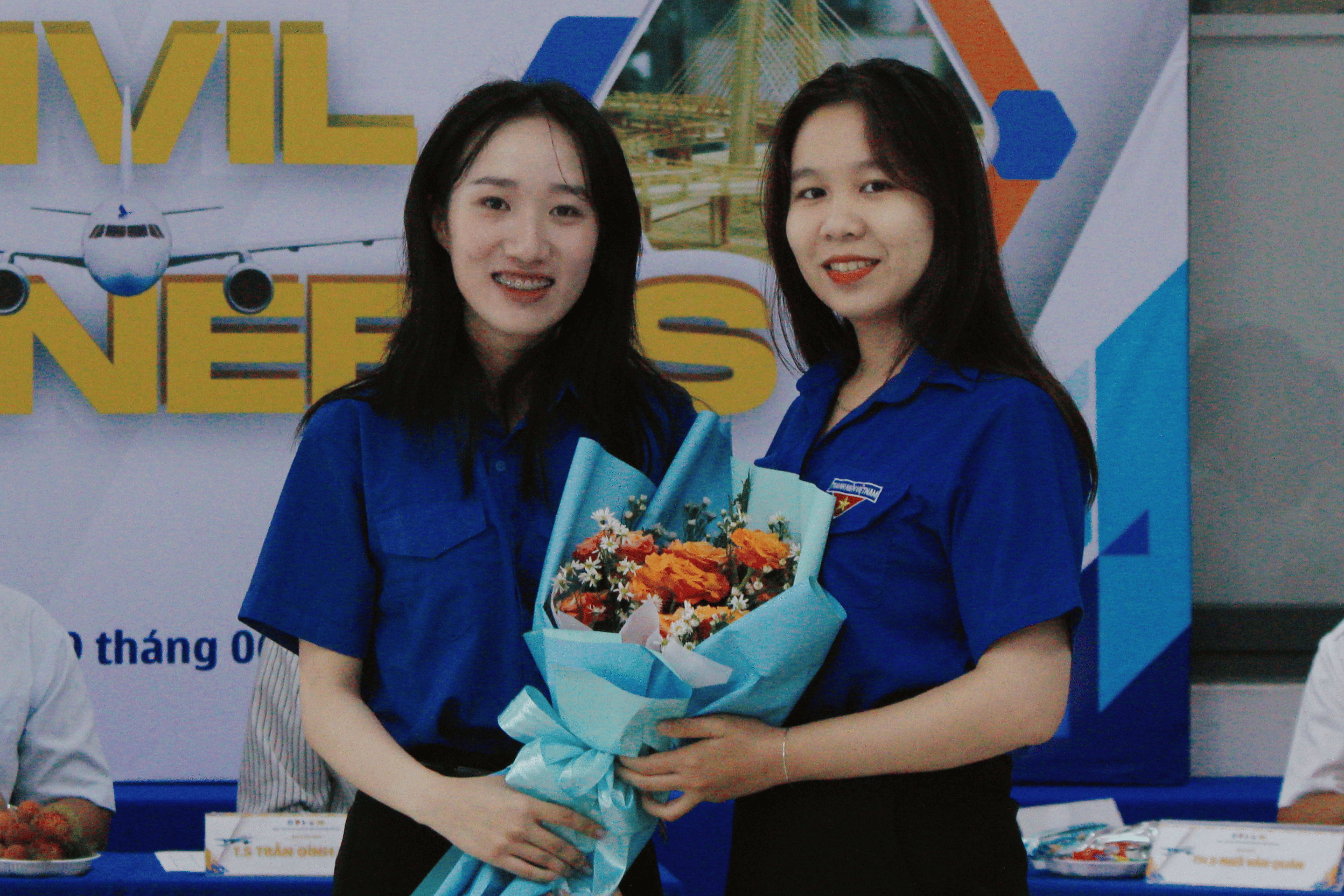 Đồng chí Nguyễn Trúc Lin Na – Phó Bí thư Đoàn Khoa Xây dựng trao hoa cảm ơn cho Đồng chí Nguyễn Thanh Hảo – Bí thư Đoàn Thanh niên Học viện Hàng không Việt Nam. (Ảnh: Đoàn – Hội Khoa Xây dựng)