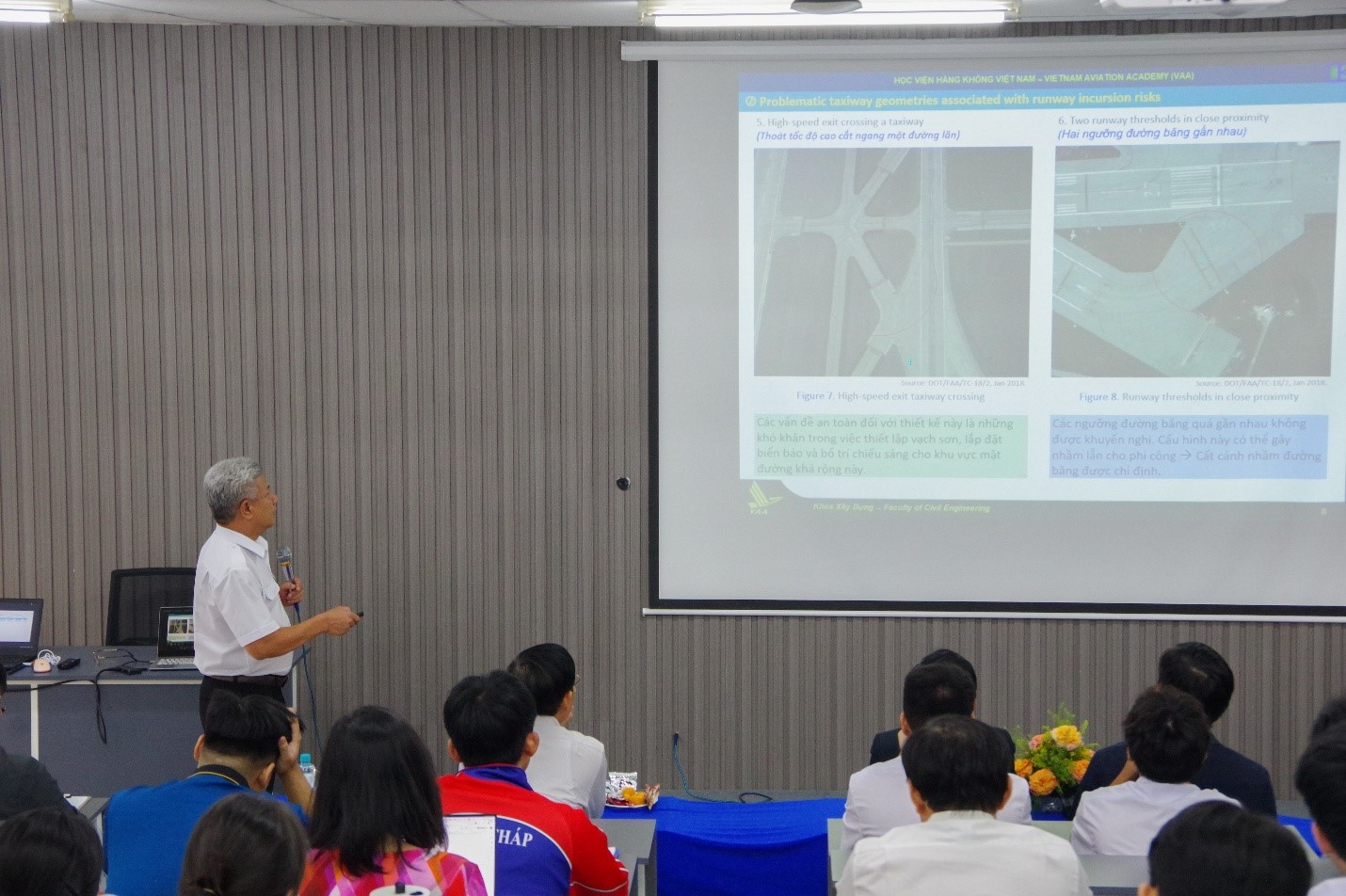 - TS. Nguyễn Hữu Huy đã trình bày chuyên đề “Giảm thiểu và ngăn ngừa xâm phạm đường băng (Runway Incursion Mitigation and Prevention)”. Báo cáo đã phân tích những thách thức trong quy hoạch không gian khu bay, đưa ra những giải pháp an toàn hàng không đáp ứng tiêu chuẩn khắt khe của ICAO.