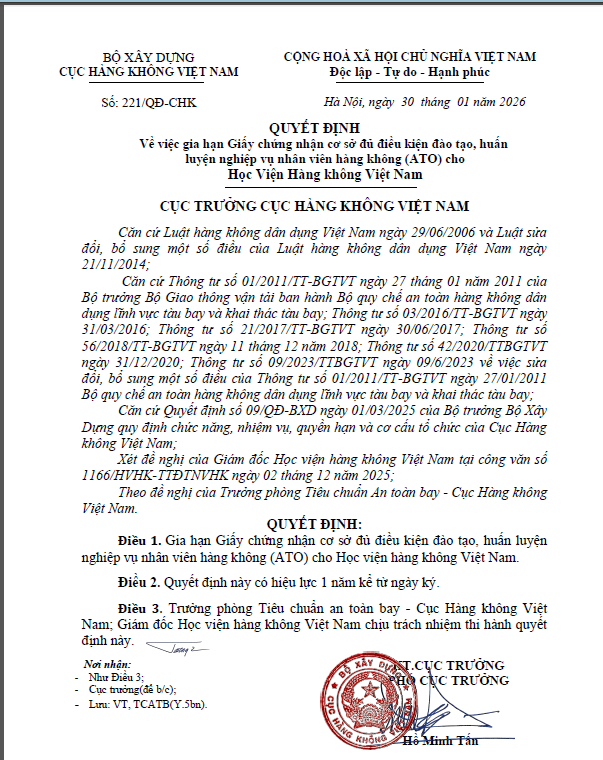 Giấy chứng nhận phê chuẩn của Cục Hàng không Việt Nam về các khóa đào tạo, huấn luyện
