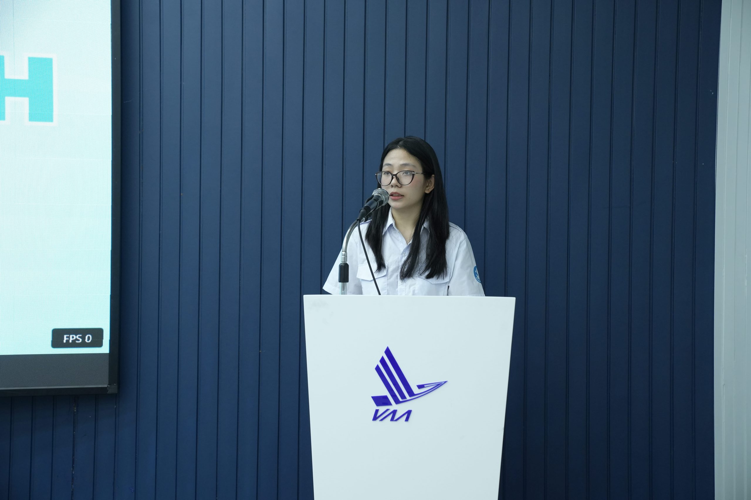 Đồng chí Nguyễn Huỳnh Hồng Cẩm – Chủ tịch Hội Sinh viên Việt Nam Học viện Hàng không Việt Nam phát biểu tại buổi lễ. (Ảnh: Đoàn Thanh niên – Hội Sinh viên VAA)