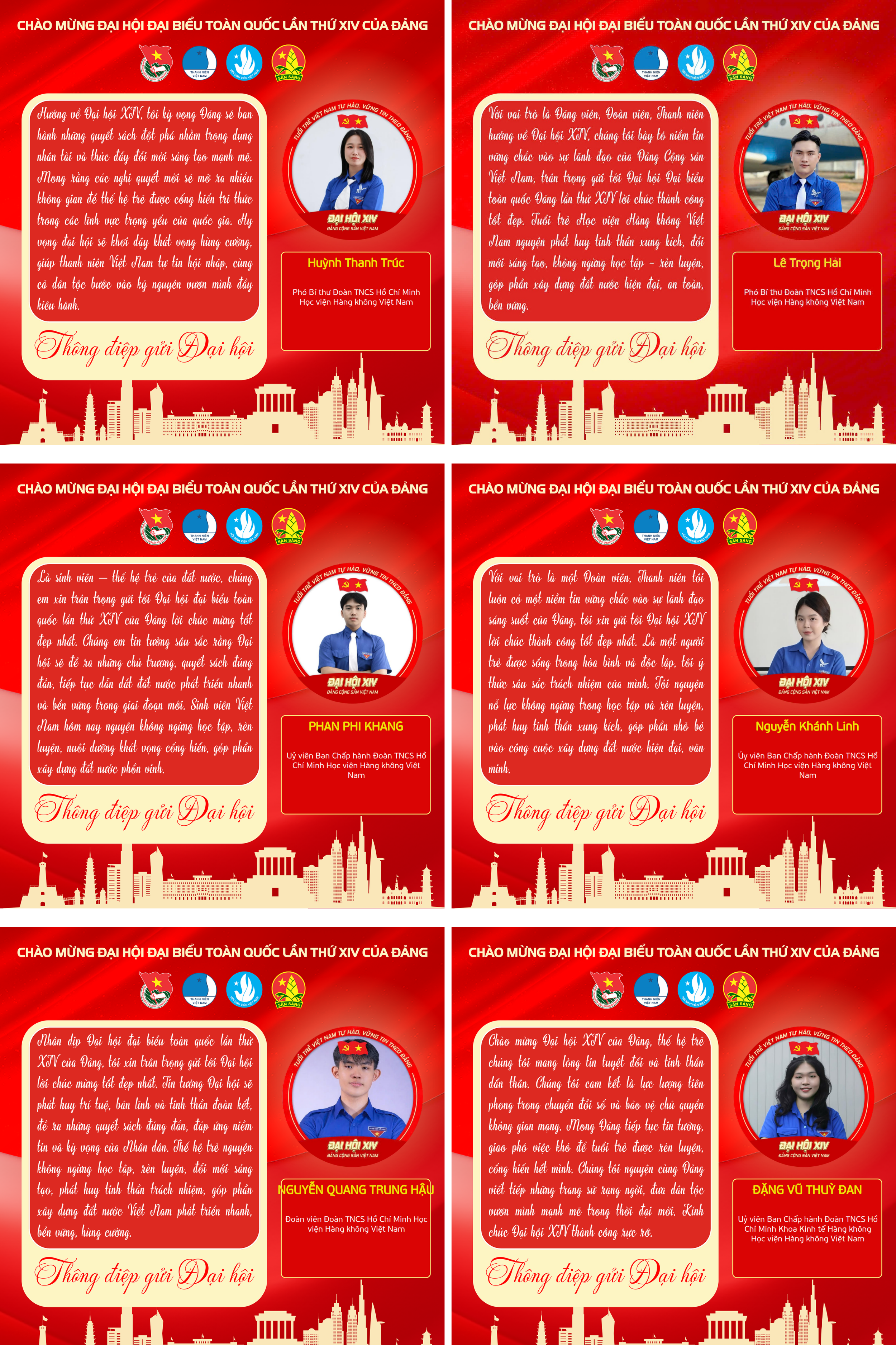 Không chỉ dừng lại ở việc lan tỏa hình ảnh trực quan, Tuổi trẻ Học viện Hàng không Việt Nam còn tích cực hưởng ứng chiến dịch gửi “Thông điệp tới Đại hội” do Trung ương Đoàn TNCS Hồ Chí Minh phát động. Thông qua những dòng chia sẻ chân thành, trách nhiệm và đầy kỳ vọng, đoàn viên, sinh viên đã bày tỏ niềm tin sâu sắc vào sự lãnh đạo của Đảng, đồng thời gửi gắm mong muốn về một đất nước Việt Nam phát triển bền vững, giàu mạnh, văn minh trong giai đoạn mới.